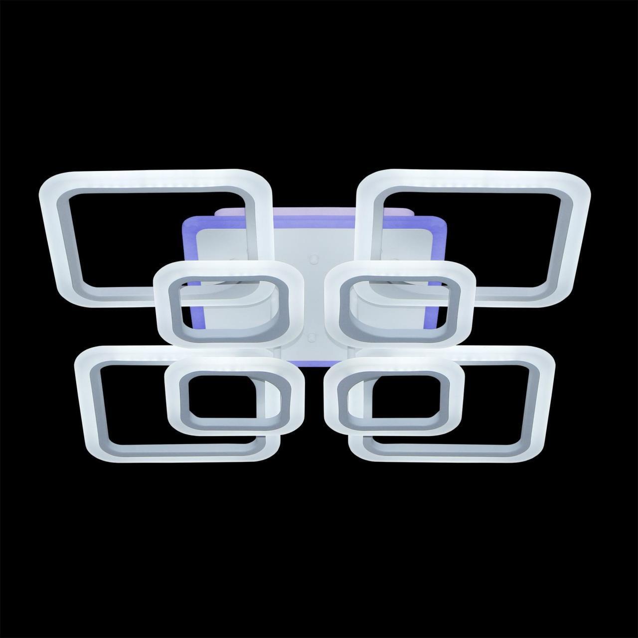 Светильник белый матовый, с квадратным основанием. Восемь светодиодных модулей плафонов, формирующих внешний вид люстры, выполнены в форме квадратных колец. Корпус плафонов белого цвета изготовлен из металла, рассеиватель белый матовый из оптического полимера.