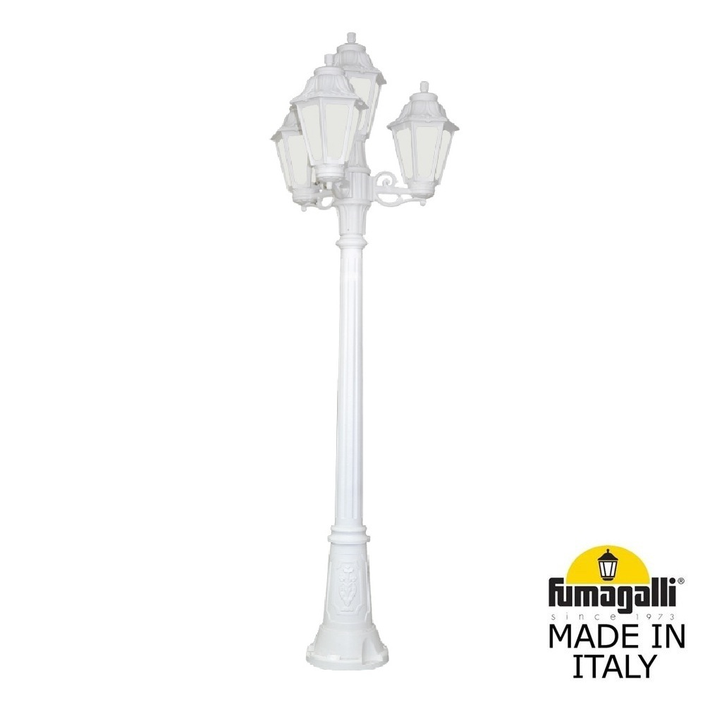 Садово-парковый фонарь FUMAGALLI серии ANNA, модель ANNA/ARTU/BISSO 3+1. Парковый торшер, столб ARTU с тремя уличными фонарями ANNA на двух малых консолях BISSO и одним светильником на опоре. Используются для архитектурного и ландшафтного освещения в стиле "классика". Место установки столбиков освещения - парковые дорожки, cкверы, садовые участки, тротуары, а так же ландшафтные и архитектурные объекты. Могут устанавливаться и внутри помещений в качестве декоративных уличных фонарей. Изготовлены в Италии, по уникальным технологиям "FUMAGALLI" из современного композитного полимера RESIN. Этот материал в 5 раз прочнее металла, не ржавеет, не окисляется, не выгорает на солнце, его не нужно красить. Все светильники пыле-влаго защищены по стандарту IP55 (защита от пыли, защита от струй воды, падающих под любым углом). Рассеиватель выполнен из антивандального, не мутнеющего и не горючего PMMA (ПолиМетилМетаАкрилат). Срок службы светильника - не менее 20 лет. Температура использования от -60 до +90. В серии ANNA есть фонари в настенном (BISSO/ANNA, PORPORA/ANNA) подвесном (SICHEM/ANNA, SICHEM/ANNA 3L) и наземном исполнении (IAFAET.R/ANNA, ALOE.R/ANNA, ARTU/ANNA, GIGI/ANNA, RICU/ANNA, RICU/ISSO/ANNA 1L, RICU/ISSO/ANNA 2L, RICU/ISSO/ANNA 3L) со столбами разной высоты, с разным количеством и конфигурацией голов. Консоли настенных фонарей и кронштейны светильников на столбах освщения могут устанавливаться вверх/вниз. Столбы выше 150 см имеют в основе мощную стальную трубу с двойной оцинковкой. При заказе требуется выбрать цвет корпуса, цвет плафона и тип патрона (Е-27 или LED GX-53). Возможен светодиодный вариант. По стилю и дизайну серия уличных светильников ANNA похожа на светильники среднего размера серии RUT и на светильники большого размера серии NOEMI. По размеру ANNA относится к малым светильникам как серия SABA и GLOBE 250.