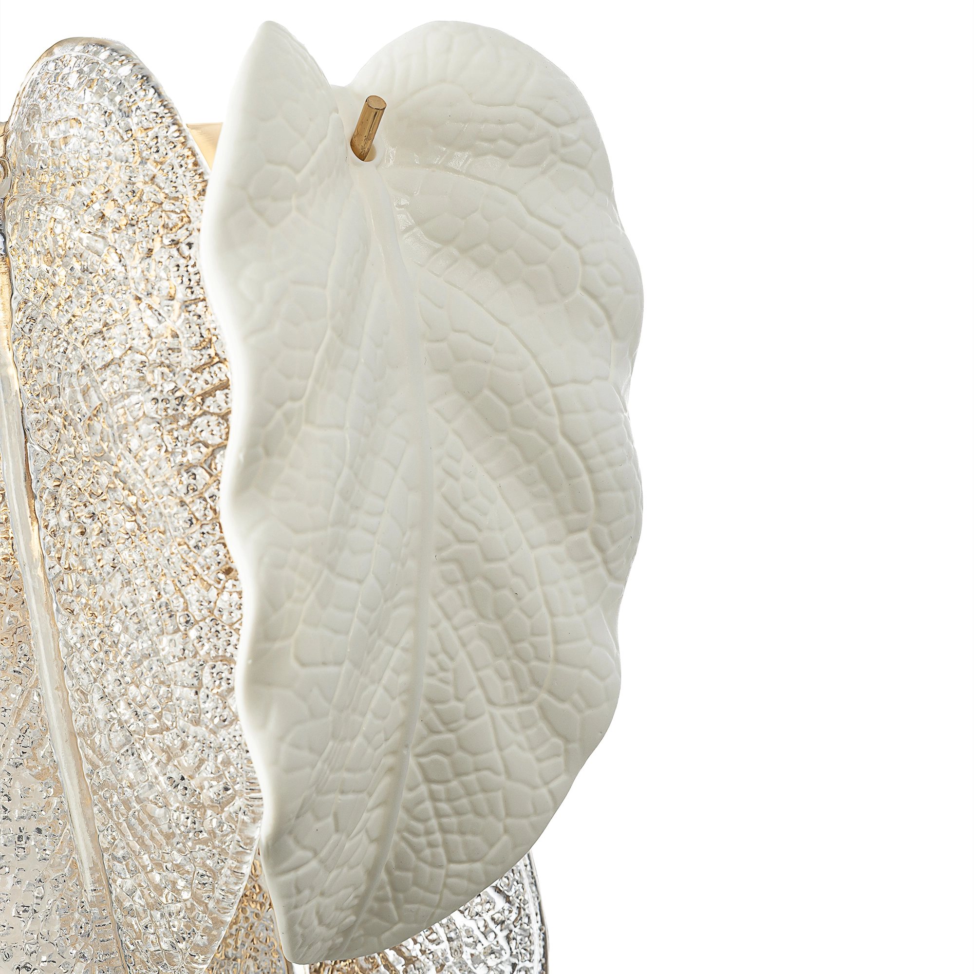 Настенное бра Citilux HASIENDA CL328350 позволяет ощутить магию арт-деко (ар-деко) в новом ключе: без излишней помпезности, но с неизменной верностью принципам стиля. Металлический каркас золотистого оттенка переливается в лучах света, вступая в гармоничный союз с листьями из матового и прозрачного стекла и керамики. Металлические листья-подвески отлиты по ювелирной технологии, что подчёркивает изысканность и чёткость флористического рисунка. В изделии используется 5 лампочек с цоколем G9, тип крепления светильника — планка.