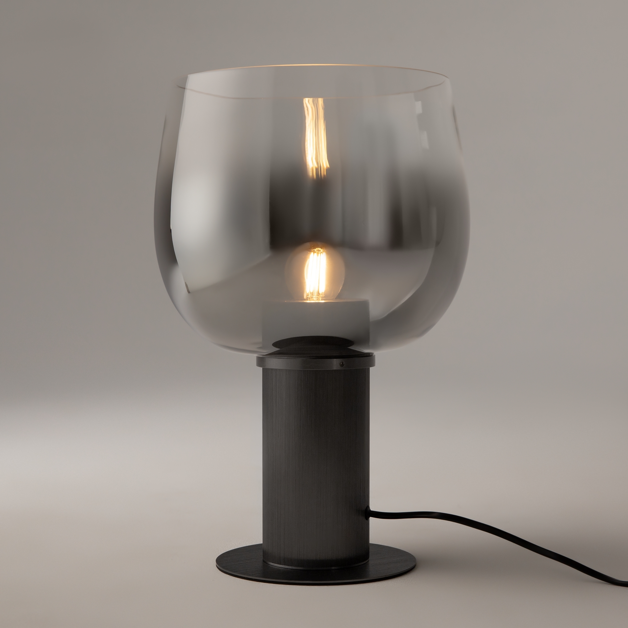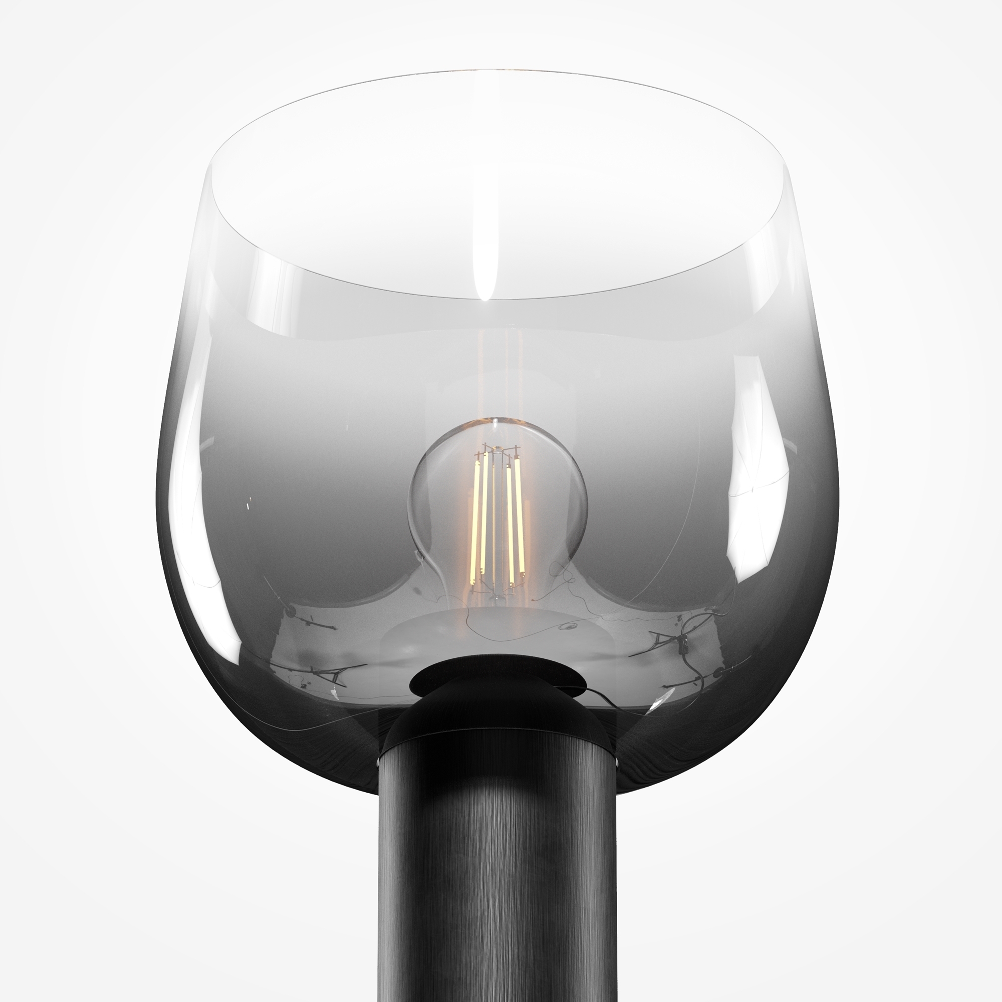 Цветовая гамма: дымчато-серый или насыщенно-янтарный цвет стекла в сочетании с черной или золотой арматурой. В серии есть модели светильников со сменным источником света с цоколем Е27 (каскадная композиция, потолочный и настольные светильники) и LED-источником (одинарные подвесные светильники). Температура свечения LED – 3000 К, угол рассеивания — 120 градусов. Плафоны каскадной композиции плафоны разных размеров и оттенков, установленные на одно основание. Оригинальный декор — актуальный вариант современной классики.