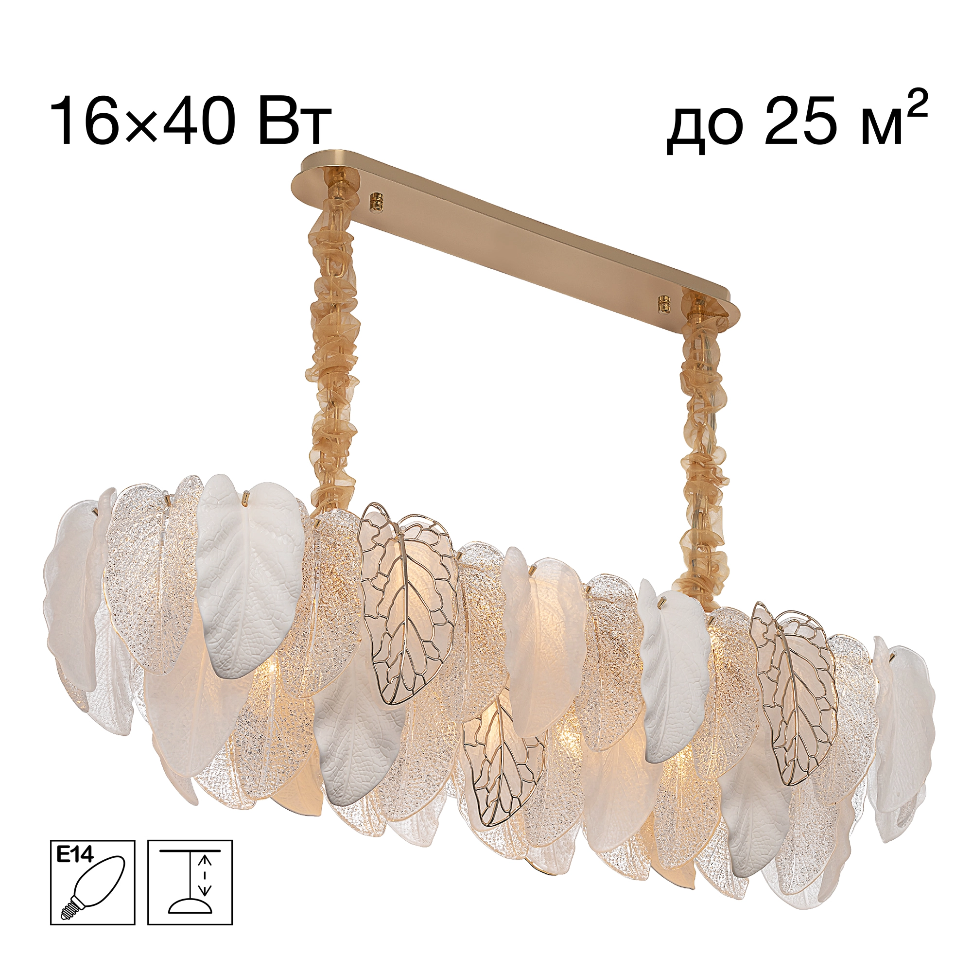 Подвесная люстра Citilux HASIENDA CL328170 позволяет ощутить магию арт-деко (ар-деко) в новом ключе: без излишней помпезности, но с неизменной верностью принципам стиля. Металлический каркас золотистого оттенка переливается в лучах света. Листья из полуматового и прозрачного рифленого стекла, белой керамики, а также металлические листья с прожилками, отлитые по ювелирной технологии, подчеркивают флористическую изысканность и четкость силуэта люстры. В изделии используются 16 лампочек с цоколем Е14, высоту подвесных цепей можно отрегулировать.