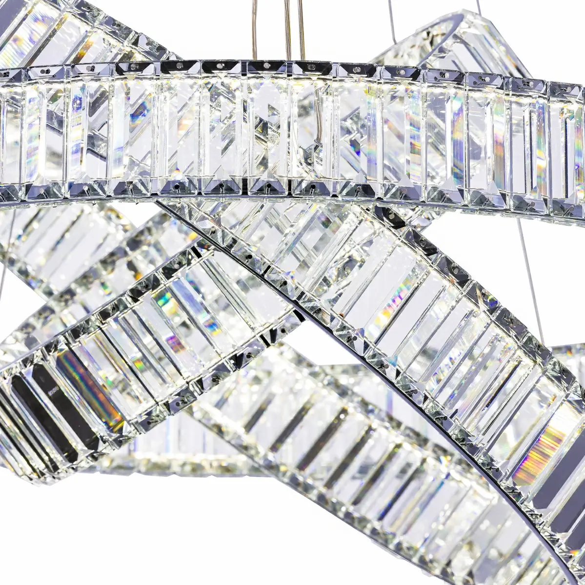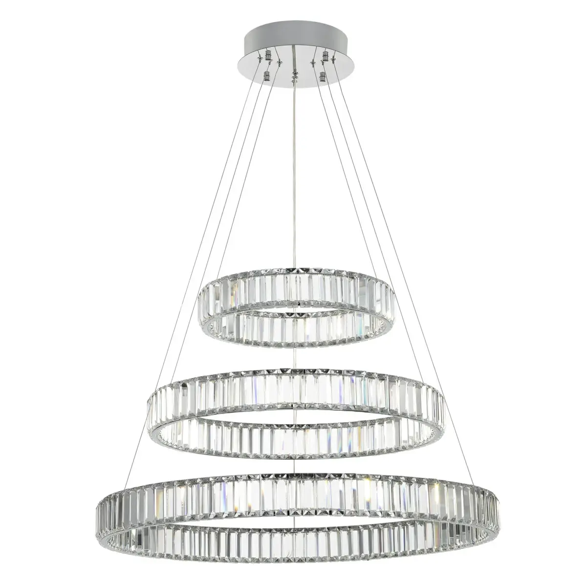 Хрустальная светодиодная люстра Citilux Чезаре CL338381 истинное произведение искусства, которое не оставит равнодушными даже самых требовательных ценителей красоты. Основание круглой формы, цвет хром. Три хрустальных кольца на металлическом каркасе, подвешены на элегантных тросиках и словно парит в воздухе. Хрустальные элементы являются воплощением кристальной прозрачности и современной огранки, они играют сияющими отблесками света и создают неповторимую атмосферу роскоши и элегантности.