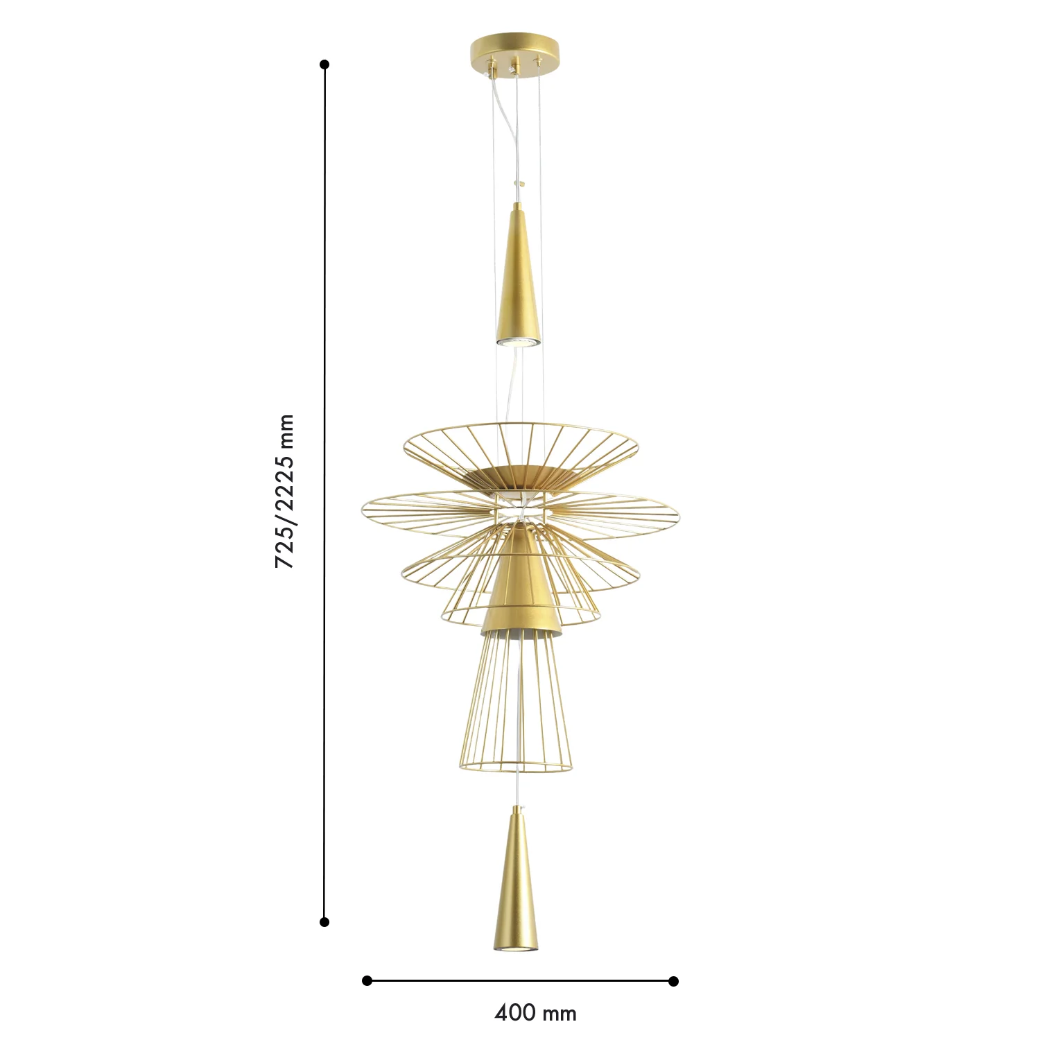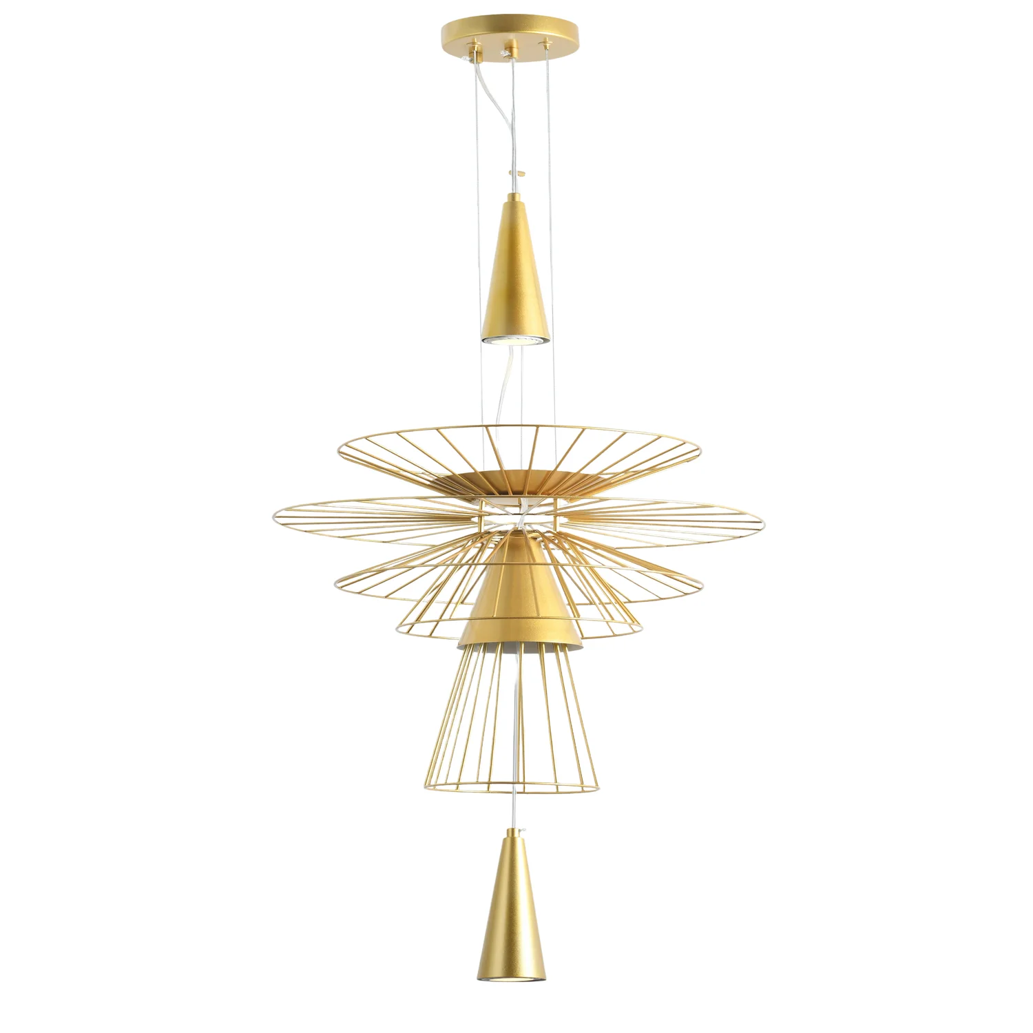 Многоуровневая конструкция из тонких металлических прутьев формирует динамичный силуэт, создавая эффект объёма и воздушности. Конусообразные плафоны направляют свет вниз, формируя акцентное освещение и подчёркивая структуру пространства. Открытая форма светильников создаёт выразительную игру света и тени, добавляя интерьеру глубину и визуальный ритм. Коллекция представлена в актуальных оттенках — чёрном и золотом, что позволяет органично интегрировать её в современные, индустриальные и минималистичные интерьеры. Ardor станет эффектным акцентом в гостиной, столовой или пространстве с высокими потолками, подчёркивая индивидуальность и характер интерьера.